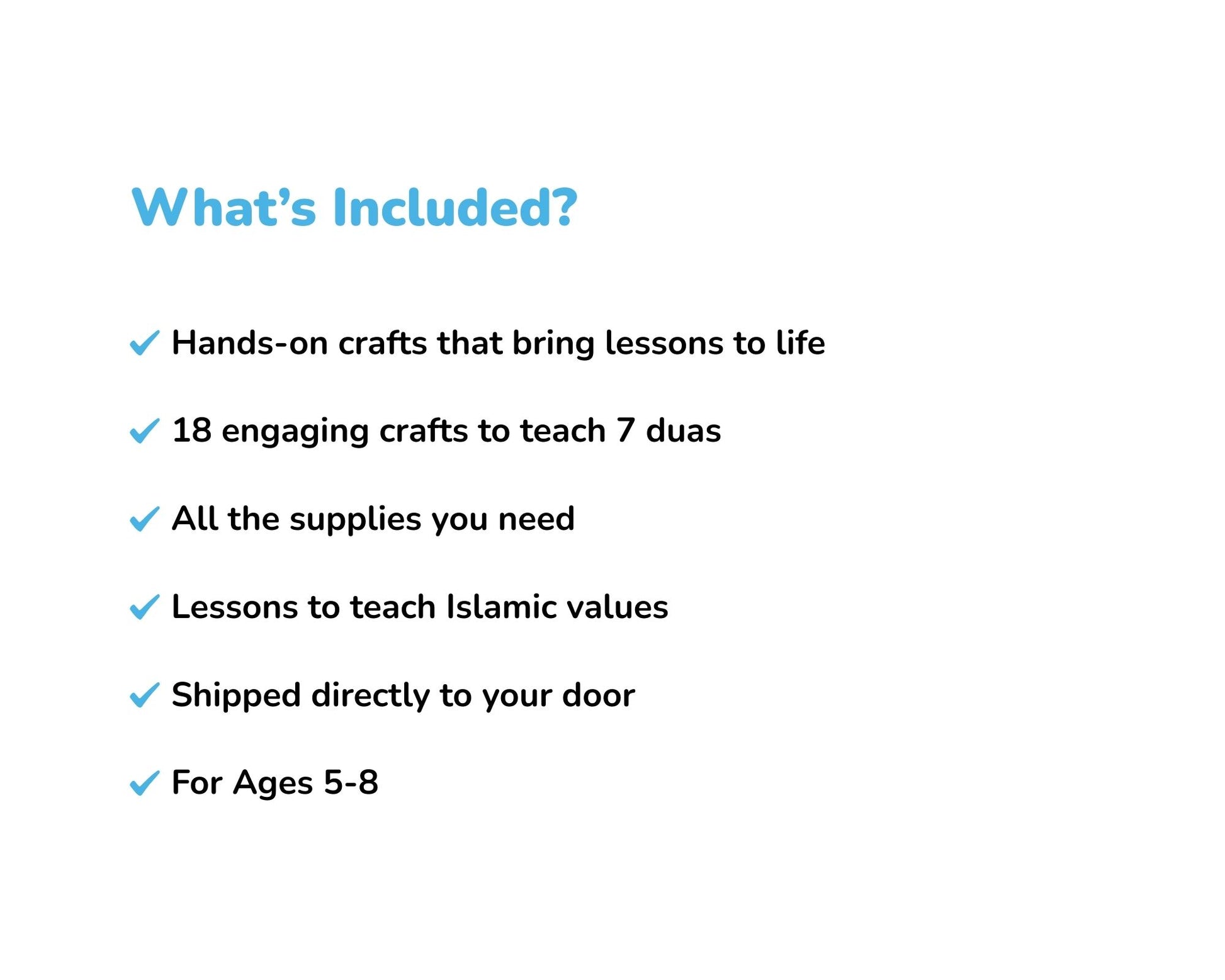 Packed with all the materials needed for 18 crafts and activities, it’s the perfect way to teach Islamic values through play—no prep required! The Daily Duas kit includes lessons to teach the following 7 duas:
